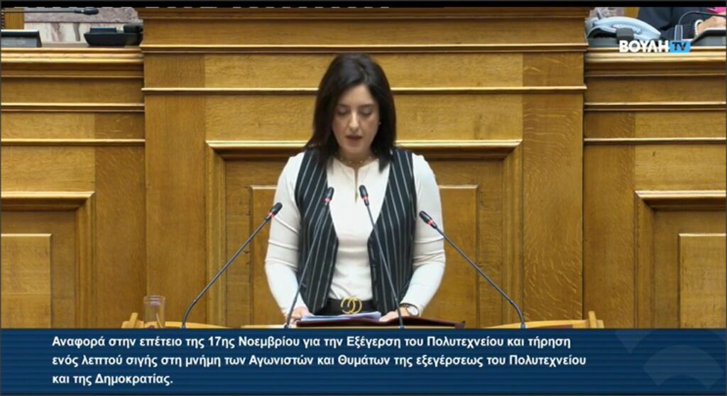 Αναφορά στην επέτειο της 17ης Νοεμβρίου για την Εξέγερση του Πολυτεχνείου από την Βουλευτή, του Β1 Βορείου Τομέα Αθηνών, Ασπασία Κουρουπάκη στην Ολομέλεια της Βουλής.