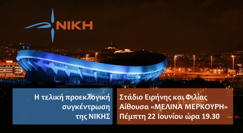 Την Πέμπτη 22 Ιουνίου, ώρα 19.30 στο Στάδιο Ειρήνης και Φιλίας (Σταθμός ΗΣΑΠ Φαλήρου) στην Συνεδριακή Αίθουσα «Μελίνα Μερκούρη» θα πραγματοποιηθεί η μεγάλη καταληκτική προεκλογική εκδήλωση της ΝΙΚΗΣ.