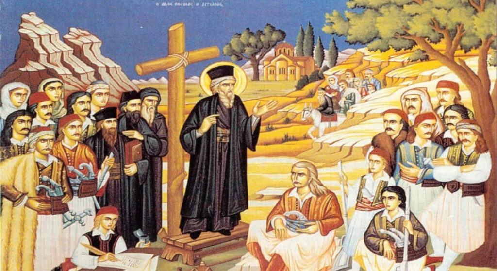 Σε εποχή που οι κατακτητές μάς αφανίζουν, που, οι «αλώπεκες του σκότους», οι παπικοί μισιονάριοι προσηλυτίζουν, οι ραγιάδες υποκύπτουν και κατά επαρχίες αλλαξοπιστούν, ο Άγιος παίρνει στους ισχνούς ώμους του τον σταυρό του Κυρίου και χτίζει σχολεία γα να μαθαίνουν τα σκλαβόπουλα «τι είναι Θεός, τι είναι Αγία Τριάς, τι είναι άγγελοι, αρχάγγελοι, τι είναι καταραμένοι οι δαίμονες, τι είναι Παράδεισος, τι είναι κόλασις, τι είναι αμαρτία και αρετή».