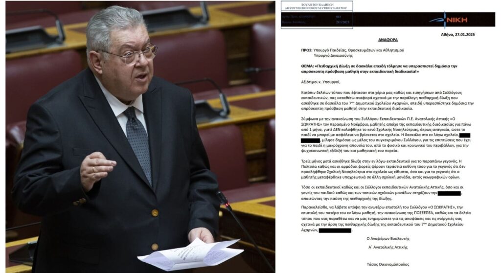 Η κυβέρνηση επιδεικνύει εγκληματική ανεπάρκεια στην κάλυψη των βασικών αναγκών του ελληνικού σχολείου όπως είναι η ύπαρξη σχολικού νοσηλευτή. Όταν δε, σημειωθούν δικαιολογημένες διαμαρτυρίες από το εκπαιδευτικό προσωπικό, αντί να σπεύσει να καλύψει τις ανάγκες, δρα τιμωρητικά εναντίον δασκάλων που στο πλαίσιο της εργασίας τους έχουν την δύναμη να διαμαρτυρηθούν για την αδιαφορία του κράτους σε βασικές ελλείψεις προσωπικού . Πιο συγκεκριμένα ασκήθηκε πειθαρχική δίωξη σε δασκάλα του 7ου Δημοτικού σχολείου Αχαρνών διότι υπερασπίστηκε την απρόσκοπτη πρόσβαση μαθητή της στην εκπαιδευτική διαδικασία καθώς το παιδί έλειπε πάνω από ένα μήνα από το σχολείο επειδή δεν καλύφθηκε το κενό του σχολικού νοσηλευτή. Για το ζήτημα αυτό ο Βουλευτής της Α΄ Ανατολικής Αττικής της ΝΙΚΗΣ κ. Τάσος Οικονομόπουλος κατέθεσε γραπτή Αναφορά στην Βουλή στις 27 /1/ 2025.