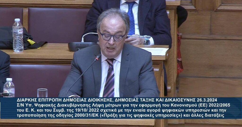 Η εισήγηση του κ. Γεώργιου Αποστολάκη, βουλευτή Επικρατείας της ΝΙΚΗΣ, στη Διαρκή Επιτροπή Δημόσιας Διοίκησης, Δημόσιας Τάξης και Δικαιοσύνης για το σχέδιο νόμου του Υπουργείου Ψηφιακής Διακυβέρνησης «Λήψη μέτρων για την εφαρμογή του Κανονισμού (ΕΕ) 2022/2065 του Ευρωπαϊκού Κοινοβουλίου και του Συμβουλίου της 19ης Οκτωβρίου 2022 σχετικά με την ενιαία αγορά ψηφιακών υπηρεσιών και την τροποποίηση της οδηγίας 2000/31/ΕΚ («Πράξη για τις ψηφιακές υπηρεσίες») και άλλες διατάξεις του Υπουργείου Ψηφιακής Διακυβέρνησης» (26/3/2024).