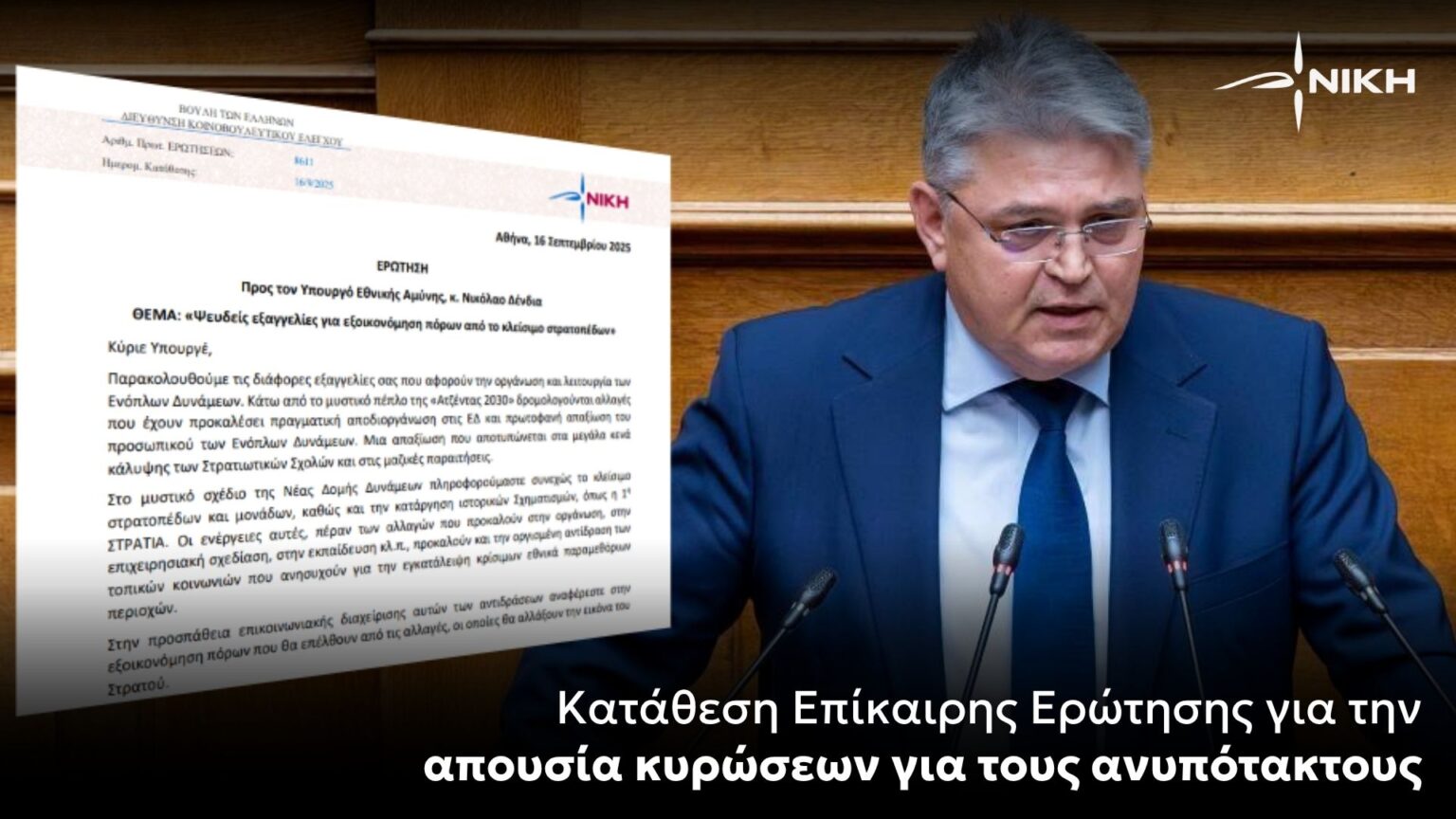 Ο Πρόεδρος της Κοινοβουλευτικής Ομάδας της ΝΙΚΗΣ, Δημήτριος Νατσιός, κατέθεσε Επίκαιρη Ερώτηση προς τον Υπουργό Εθνικής Άμυνας κ. Νικόλαο Δένδια σχετικά με την απουσία κυρώσεων για τους ανυπότακτους. Την τελευταία πενταετία ένας πολύ μεγάλος αριθμός Ελλήνων πολιτών αποφεύγει την στράτευση. Μόνο το 2024 υπήρχαν 36.663 ανυπότακτοι και μάλιστα το 40% αυτών ήταν στο εσωτερικό. Την ίδια στιγμή κλείνουν Στρατόπεδα και Μονάδες με το πρόσχημα ενίσχυσης της χαμηλής επάνδρωσης. Τελικά, υπάρχουν κυρώσεις ή συνέπειες για όσους δεν υπηρετούν την πατρίδα ή ο καθένας ενεργεί όπως τον συμφέρει; Αναμένουμε με ενδιαφέρον την απάντηση του Υπουργού στην Βουλή.