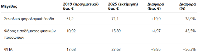 Τα στοιχεία είναι αποκαλυπτικά. Την περίοδο 2019 – 2025, τα συνολικά φορολογικά έσοδα αυξήθηκαν από € 51,2 δισ. σε € 71,1 δισ. (+€ 19,9 δισ., +38,9%). Ενδεικτικά, ο φόρος εισοδήματος φυσικών προσώπων αυξήθηκε από € 10,9 δισ. σε € 15,9 δισ. (+€ 5,0 δισ., +45,5%), πλήττοντας μισθωτούς και συνταξιούχους, ενώ ο ΦΠΑ – ο πιο άδικος φόρος – εκτοξεύθηκε από € 17,7 δισ. σε € 27,6 δισ. (+€ 9,95 δισ., +56,3%), αποτυπώνοντας την ακρίβεια και την υπερφορολόγηση της κατανάλωσης, η οποία ποτέ δεν επέστρεψε στην κοινωνία. Μετατράπηκε σε πρωτογενή πλεονάσματα € 4,7 δισ. το 2023, € 11,1 δισ. το 2024 και € 7,2 δισ. το 2025 – σωρευτικά € 23 δισ.