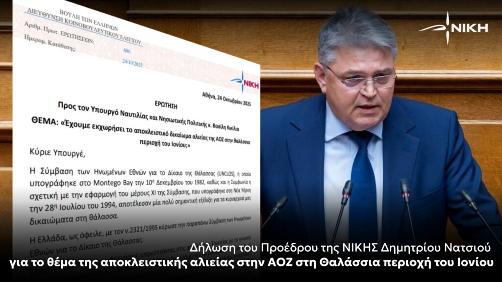 Στο πλαίσιο του κοινοβουλευτικού ελέγχου, κατέθεσα ερώτηση στο Υπουργείο Ναυτιλίας και Νησιωτικής Πολιτικής σχετικά με το θέμα της αποκλειστικής αλιείας εντός της Αποκλειστικής Οικονομικής Ζώνης στην περιοχή του Ιονίου.