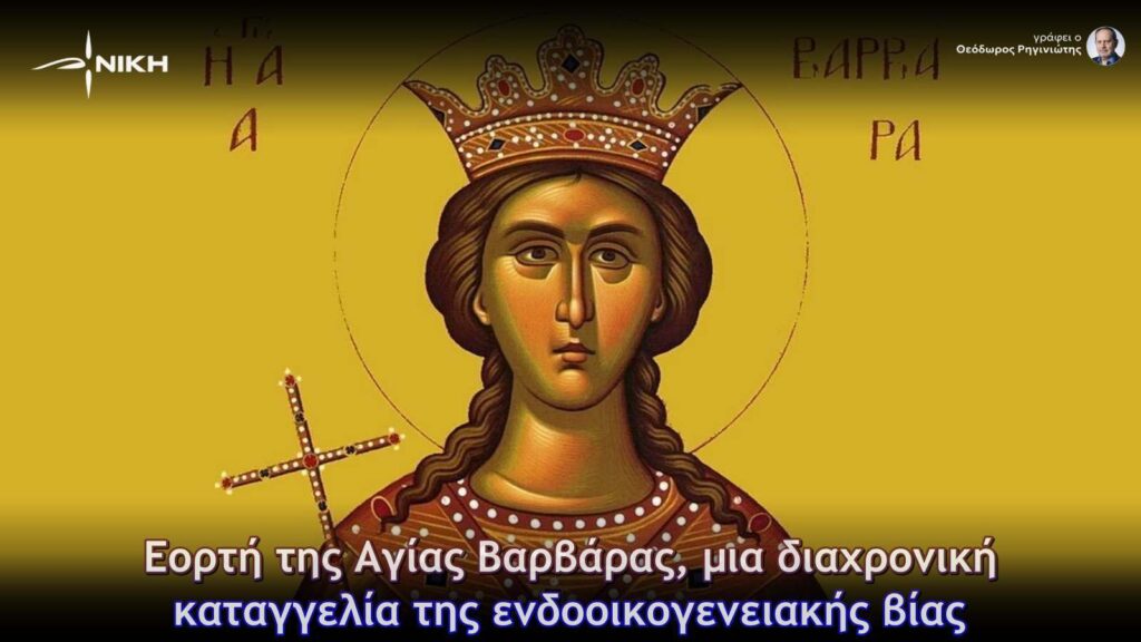 Η γιορτή της Αγίας Βαρβάρας (4 Δεκεμβρίου) είναι ένα διαχρονικό μήνυμα για τους πατεράδες (και γενικά τους γονείς και τους κηδεμόνες – αν θυμάται πια κανείς αυτή τη λέξη), καθώς και ένα μήνυμα για τα παιδιά, ιδιαίτερα τις κόρες, αλλά και τους γιους. Το μήνυμα προς τους πατεράδες είναι η καταγγελία της βίας που εκδήλωσε ο πατέρας της αγίας Βαρβάρας εναντίον του ίδιου του παιδιού του!