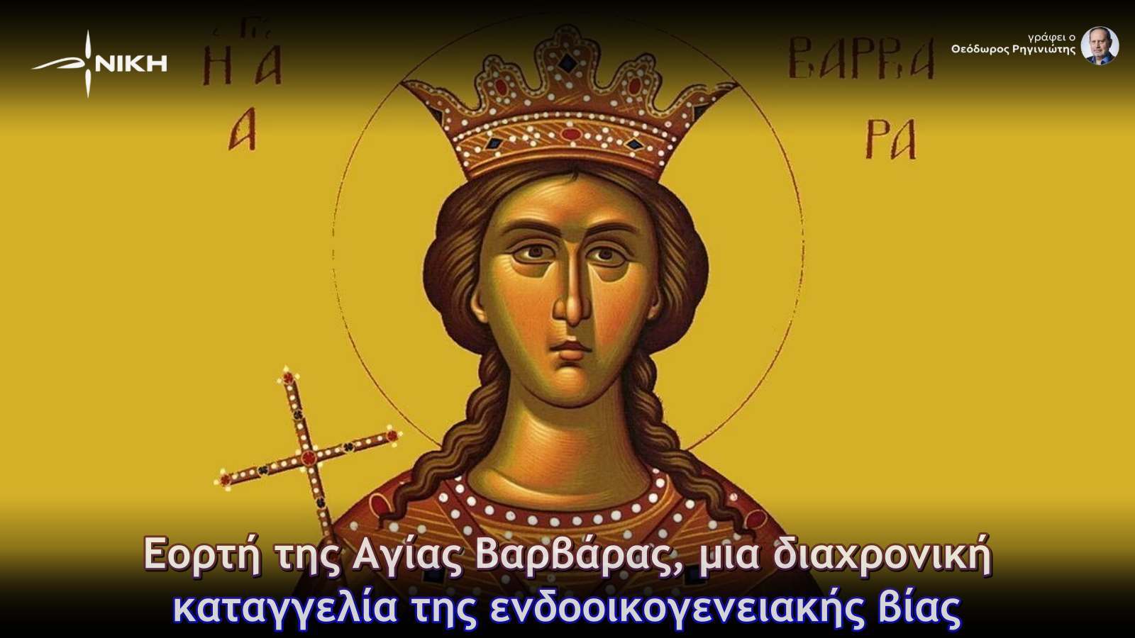 Σήμερα, που “όλα τα ξέρουμε” και με “όλα” ασχολούμαστε, εκτός από τον δικό μας ορθόδοξο πολιτισμό και την ανεκτίμητη πνευματική κληρονομιά που μεταφέρει, οι περισσότεροι νομίζω ότι αγνοούν τη ζωή της αγίας Βαρβάρας και μάλιστα φοβάμαι ότι δεν ξέρουν ούτε ότι σήμερα, 4 του Δεκέμβρη, είναι η γιορτή της (για τη γιορτή του Αγίου Ιωάννη Δαμασκηνού, του μεγάλου ποιητή της Ανάστασης και της κηδείας, που του έκοψαν το χέρι για να μη γράφει τα σπουδαία συγγράμματά του, και τη γιορτή του μεγαλομάρτυρα επισκόπου Σεραφείμ του Φαναρίου, που τον σούβλισαν οι Τούρκοι, ούτε λόγος αν τη γνωρίζουν οι περισσότεροι αδελφοί και συνάνθρωποί μας, βαπτισμένοι ορθόδοξοι χριστιανοί Έλληνες).
