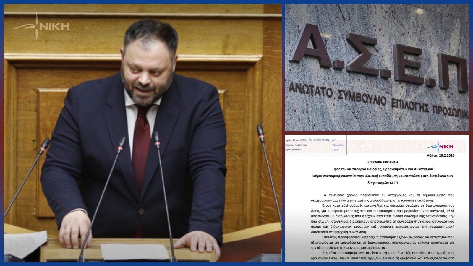 Επίκαιρη ερώτηση προς τον Υφυπουργό Παιδείας, Θρησκευμάτων και Αθλητισμού, Νικόλαο Παπαϊωάννου, απηύθυνε ο Βουλευτής Αχαΐας της ΝΙΚΗΣ Σπυρίδων Τσιρώνης, με θέμα: «Ανεπαρκής εποπτεία στην ιδιωτική εκπαίδευση και επιπτώσεις στη διαφάνεια των διαγωνισμών ΑΣΕΠ».