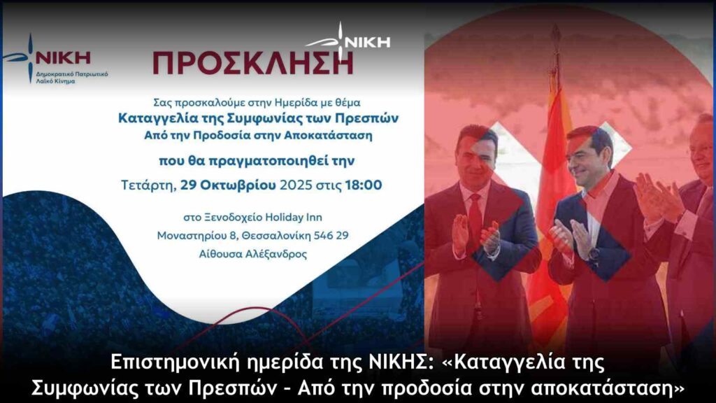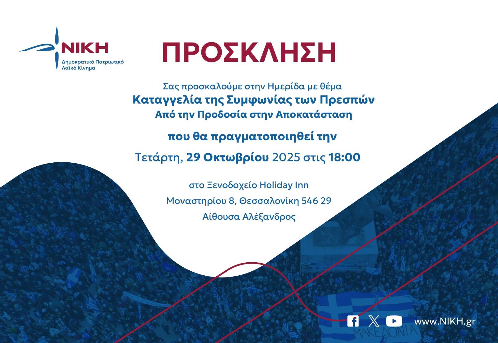 Το Δημοκρατικό Πατριωτικό Κίνημα ΝΙΚΗ διοργανώνει την Τετάρτη 29 Οκτωβρίου 2025, στις 18:00, ημερίδα με θέμα «Καταγγελία της Συμφωνίας των Πρεσπών – Από την Προδοσία στην Αποκατάσταση». Η ημερίδα θα πραγματοποιηθεί στο ξενοδοχείο Holiday Inn (Μοναστηρίου 8, Θεσσαλονίκη), Αίθουσα «Αλέξανδρος».