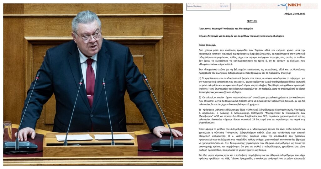 Δύο χρόνια μετά την ανείπωτη τραγωδία των Τεμπών αλλά και ενάμιση χρόνο μετά την κακοκαιρία «Daniel» και παρά τις πρόσφατες διαβεβαιώσεις του Υπουργού Υποδομών και Μεταφορών, τα προβλήματα στον ελληνικό σιδηρόδρομο παραμένουν. Ερώτηση κατέθεσε ο Τάσος Οικονομόπουλος, βουλευτής Α΄ Ανατολικής Αττικής της ΝΙΚΗΣ σχετικά με το μέλλον του ελληνικού σιδηροδρόμου, την κατάσταση και τις συνθήκες λειτουργίας αυτού, καθώς και για τα κονδύλια σε εταιρείες που δεν παρέχουν τα βασικά εφόδια.
