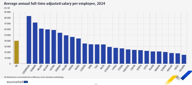Τα στοιχεία της Eurostat για το 2024 (αναρτήθηκαν το Νοέμβριο του 2025) αποκαλύπτουν με αδιαμφισβήτητους αριθμούς τη μισθολογική και κοινωνική φτωχοποίηση της Ελλάδας. Ο μέσος ετήσιος μισθός πλήρους απασχόλησης στη χώρα μας ανέρχεται μόλις στα 17.954 ευρώ, κατατάσσοντας την Ελλάδα 26η στα 27 κράτη-μέλη της ΕΕ, πάνω μόνο από τη Βουλγαρία. Την ίδια στιγμή, ο μέσος όρος της Ευρωπαϊκής Ένωσης διαμορφώνεται στα 39.808 ευρώ, δηλαδή ο Έλληνας εργαζόμενος αμείβεται με λιγότερο από το 45% του Ευρωπαίου πολίτη.