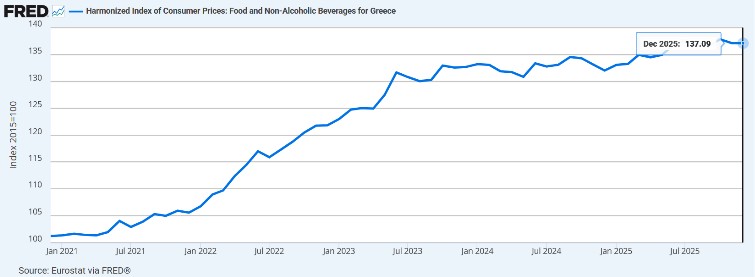 Την ίδια περίοδο, ο πληθωρισμός τροφίμων στην Ελλάδα ξεπέρασε το 35,5%, σχεδόν τριπλάσιος της αύξησης των μισθών, διαλύοντας κυριολεκτικά την αγοραστική δύναμη των εργαζομένων. Πρόκειται για πραγματική μείωση εισοδήματος, όχι για στατιστικό φαινόμενο. Οι εργαζόμενοι πληρώνουν πολύ ακριβότερα τρόφιμα, ενέργεια και στέγη, ενώ οι μισθοί παραμένουν καθηλωμένοι, αποτέλεσμα της κυβερνητικής πολιτικής για βίαιη εσωτερική υποτίμηση.