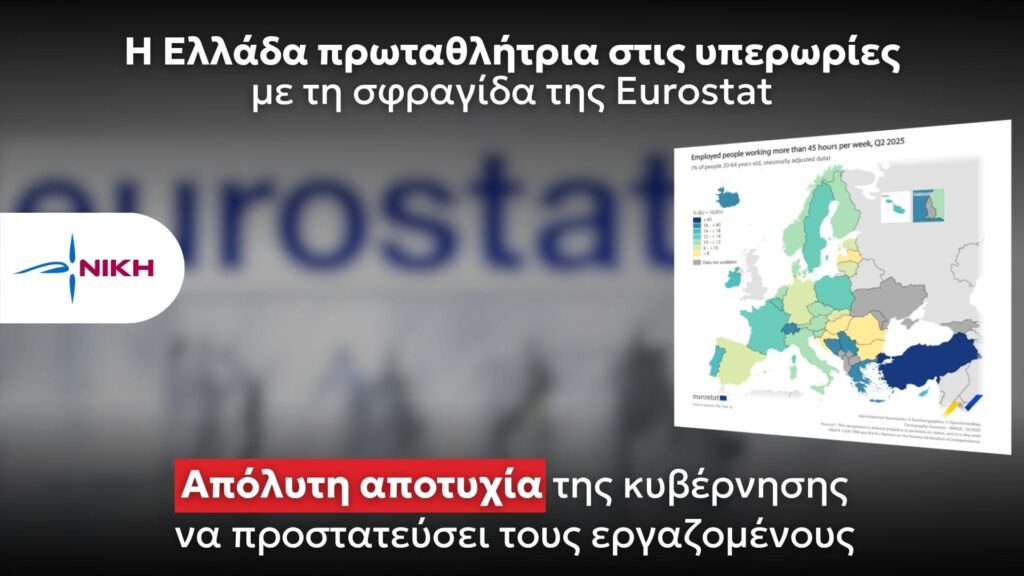 Τα στοιχεία της Eurostat για το 2025 αποκαλύπτουν ότι η Ελλάδα καταγράφει το υψηλότερο ποσοστό υπερωριών στην Ε.Ε., με το 20,9% των εργαζομένων να εργάζεται πάνω από 45 ώρες την εβδομάδα — σχεδόν διπλάσιο από τον ευρωπαϊκό μέσο όρο (10,8%).