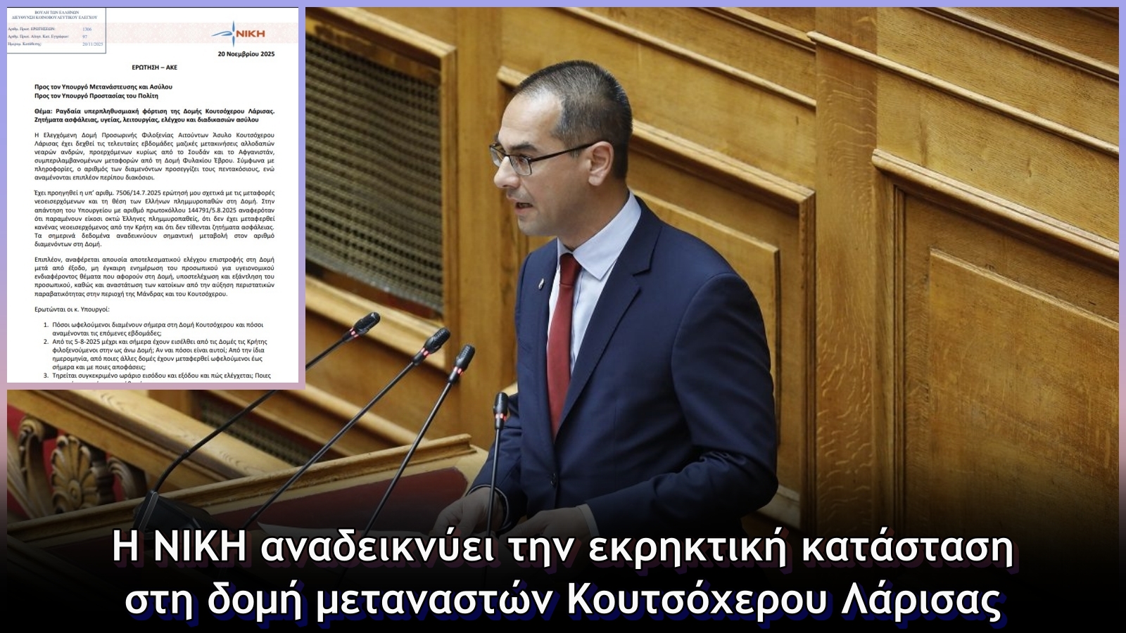 Με μια νέα, αιχμηρή και τεκμηριωμένη κοινοβουλευτική παρέμβαση, ο βουλευτής Λαρίσης και αντιπρόεδρος της ΝΙΚΗΣ, Γεώργιος Ρούντας, αναδεικνύει τη σοβαρή και αδικαιολόγητη επιδείνωση της κατάστασης στην Ελεγχόμενη Δομή Προσωρινής Φιλοξενίας Κουτσόχερου Λάρισας, απαιτώντας ξεκάθαρες και άμεσες απαντήσεις από το Υπουργείο Μετανάστευσης & Ασύλου και το Υπουργείο Προστασίας του Πολίτη.