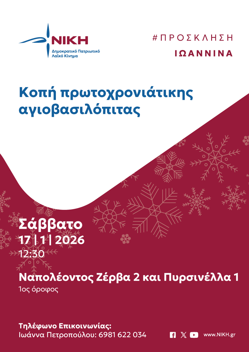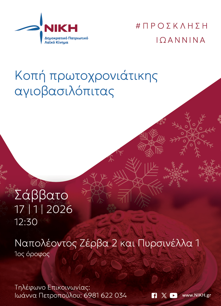 Η Τοπική Κοινότητα Ιωαννίνων της ΝΙΚΗΣ προσκαλεί τα μέλη, τους φίλους και όλους τους πολίτες της περιοχής στην εκδήλωση για την κοπή της Πρωτοχρονιάτικης Αγιοβασιλόπιτας, που θα πραγματοποιηθεί το Σάββατο 17 Ιανουαρίου 2026, στις 12:30 το μεσημέρι.