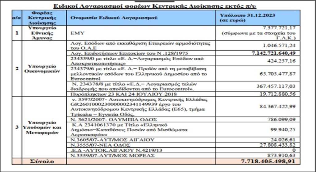 Ειδικότερα το ανώτατο Ελεγκτικό Δικαστήριο εντόπισε την ύπαρξη 14 Ειδικών Λογαριασμών εκτός Προϋπολογισμού με ταμειακό υπόλοιπο την 31.12.2023 ύψους 7,71 δις ευρώ. Όπως σημειώνεται στην Έκθεση «η τήρηση ειδικών λογαριασμών συνιστά παρέκκλιση από βασικές συνταγματικές και δημοσιονομικές αρχές που υπαγορεύουν το ενιαίο της διαχείρισης και λογοδοσίας αναφορικά με τα έσοδα και έξοδα του κράτους». Άλλωστε πλειάδα νόμων (ν.2771/1999, ν.3697/2008) απαγορεύει ρητά την σύσταση Ειδικών Λογαριασμών.