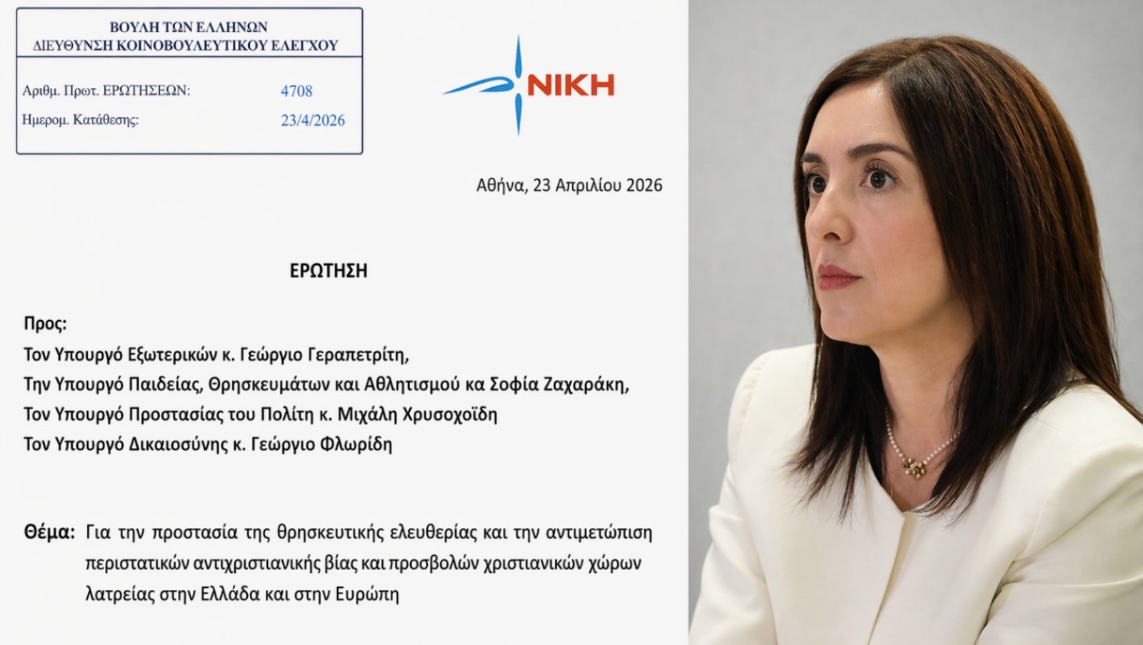 Σημαντικά ερωτήματα προς την κυβέρνηση για την προστασία της θρησκευτικής ελευθερίας και την αντιμετώπιση περιστατικών αντιχριστιανικής βίας θέτει με κοινοβουλευτική της παρέμβαση η βουλευτής Β1 Βόρειου Τομέα Αθηνών της ΝΙΚΗΣ, Ασπασία Κουρουπάκη.