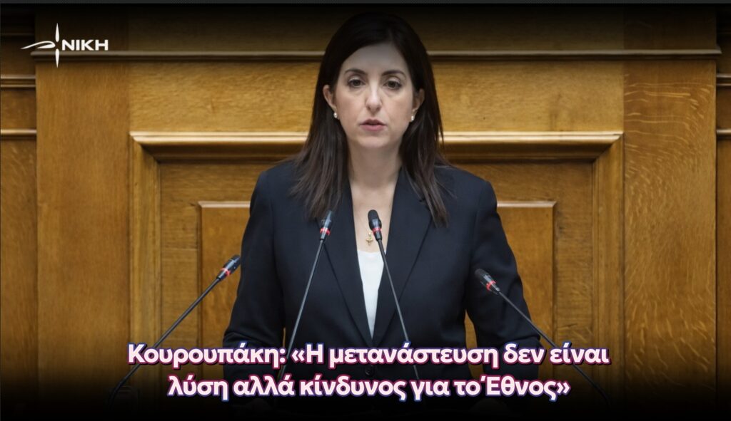 Παρέμβαση με έντονο πολιτικό, θεσμικό και εθνικό φορτίο πραγματοποίησε στην Ολομέλεια της Βουλής η βουλευτής Β1 Βορείου Τομέα του Κινήματος ΝΙΚΗ, Ασπασία Κουρουπάκη, κατά τη συζήτηση και ψήφιση του νομοσχεδίου για το μεταναστευτικό, θέτοντας στο επίκεντρο τις συνέπειες της κυβερνητικής πολιτικής στη δημόσια ασφάλεια, τη δημογραφική προοπτική και την εθνική συνοχή της χώρας.