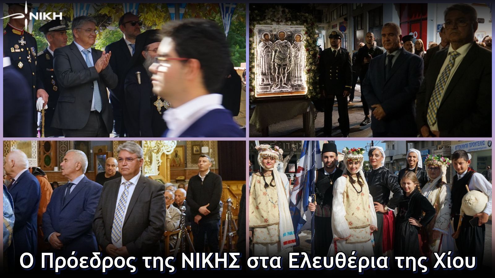 Το πρωί της Τρίτης ο πρόεδρος της ΝΙΚΗΣ συμμετείχε στην Πανηγυρική Αρχιερατική Θεία Λειτουργία στον Ιερό Μητροπολιτικό Ναό Χίου. Λίγο πριν το τέλος της Δοξολογίας, τον Πανηγυρικό της ημέρας εκφώνησε ο Μητροπολίτης Χίου κ. Μάρκος. Ακολούθησε τρισάγιο και κατάθεση στεφάνων στο Ηρώο Πεσόντων.