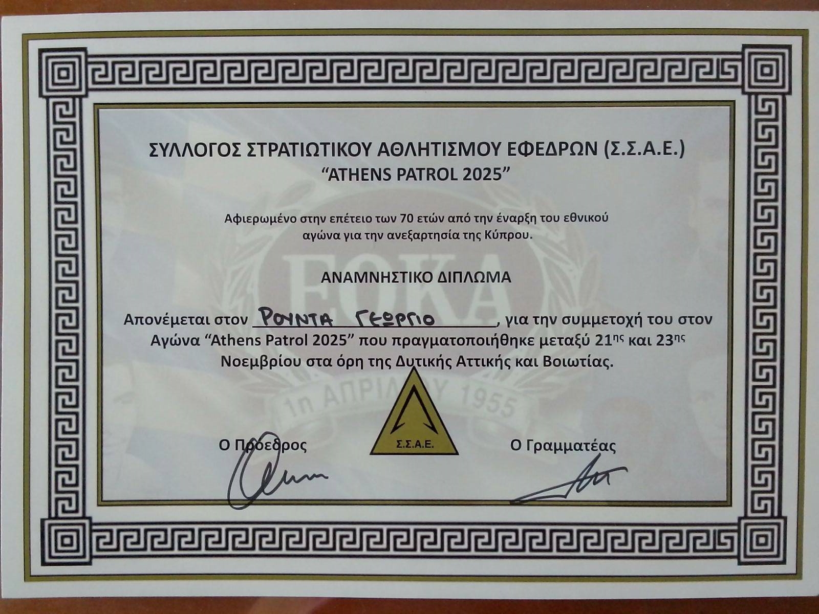 Με απόλυτη επιτυχία ολοκληρώθηκε ο Πανελλήνιος Αγώνας – Άσκηση Εθελοντών Εφέδρων «ATHENS PATROL 2025», μια απαιτητική διοργάνωση αξιολόγησης ετοιμότητας της εθελοντικής εφεδρείας, που πραγματοποιείται εδώ και έντεκα χρόνια από τον Σύλλογο Στρατιωτικού Αθλητισμού Εφέδρων (ΣΣΑΕ / MPF). Ο φετινός αγώνας διεξήχθη από τις 21 έως τις 23 Νοεμβρίου στα Δερβενοχώρια Αττικής (Δυτική Πάρνηθα) και ήταν αφιερωμένος στα 70 χρόνια από την έναρξη του εθνικού αγώνα της ΕΟΚΑ για την ανεξαρτησία της Κύπρου.