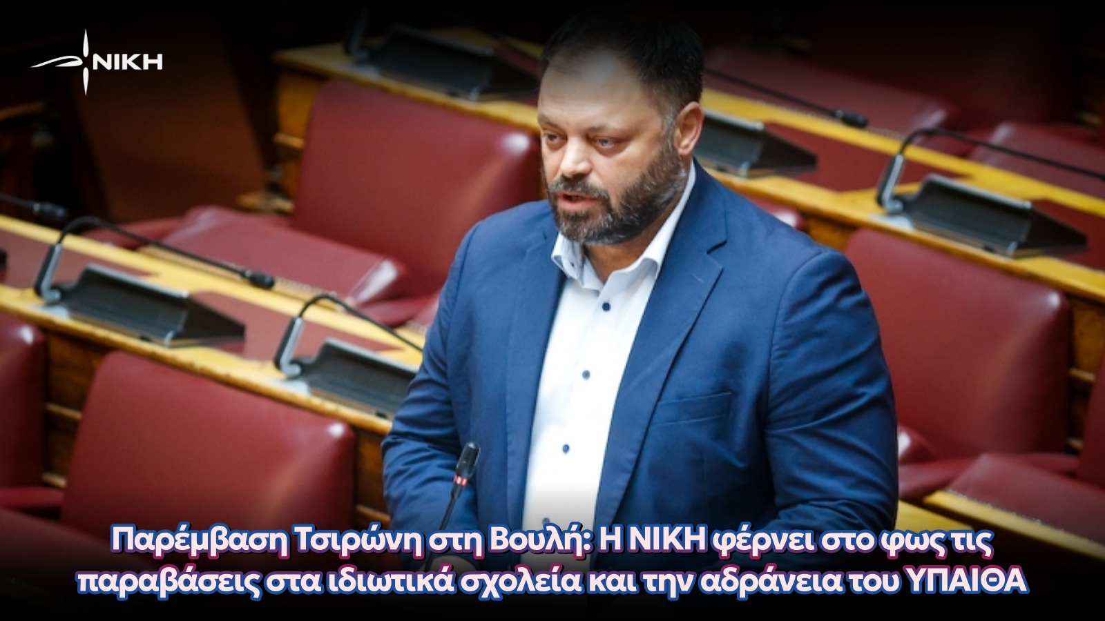 Τις σοβαρές παραβάσεις της εκπαιδευτικής και εργατικής νομοθεσίας στα ιδιωτικά σχολεία ανέδειξε στη Βουλή ο βουλευτής Αχαΐας της ΝΙΚΗΣ, Σπύρος Τσιρώνης, ζητώντας συγκεκριμένα στοιχεία για τους ελέγχους που διενεργήθηκαν τα τελευταία τρία χρόνια κατόπιν καταγγελιών εκπαιδευτικών και για τις κυρώσεις που επιβλήθηκαν.