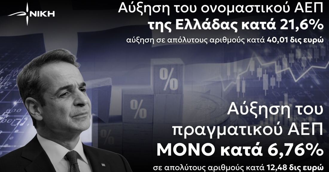 Σύμφωνα με την Ελληνική Στατιστική Αρχή το Πραγματικό ΑΕΠ της Ελλάδας σε σταθερές τιμές του 2020, από το 2019 που ανέλαβε η κυβέρνηση της ΝΔ αυξήθηκε από 184,5 δις ευρώ σε 196,98 δις ευρώ το 2023. Οπότε υπήρξε μια αύξηση σε απολύτους αριθμούς κατά 12,48 δις ευρώ ή σε ποσοστό κατά 6,76%.