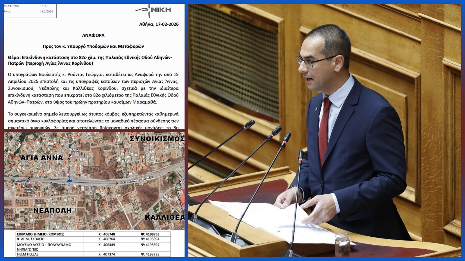 Αναφορά προς τον Υπουργό Υποδομών και Μεταφορών κατέθεσε ο Βουλευτής της ΝΙΚΗΣ, Γεώργιος Ρούντας, φέρνοντας στη Βουλή το σοβαρό ζήτημα οδικής ασφάλειας στο 82ο χιλιόμετρο της Παλαιάς Εθνικής Οδού Αθηνών-Πατρών, στο ύψος της Αγίας Άννας Κορίνθου.