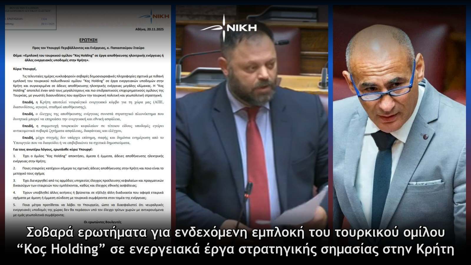 Σοβαρές ανησυχίες εγείρονται τις τελευταίες ημέρες μετά τις δημοσιογραφικές πληροφορίες που κάνουν λόγο για πιθανή εμπλοκή του τουρκικού πολυεθνικού ομίλου “Koç Holding” σε έργα αποθήκευσης ηλεκτρικής ενέργειας μεγάλης κλίμακας στην Κρήτη. Η ΝΙΚΗ φέρνει το ζήτημα στη Βουλή, ζητώντας άμεση και πλήρη ενημέρωση από τον Υπουργό Περιβάλλοντος και Ενέργειας, κ. Σταύρο Παπασταύρου.
