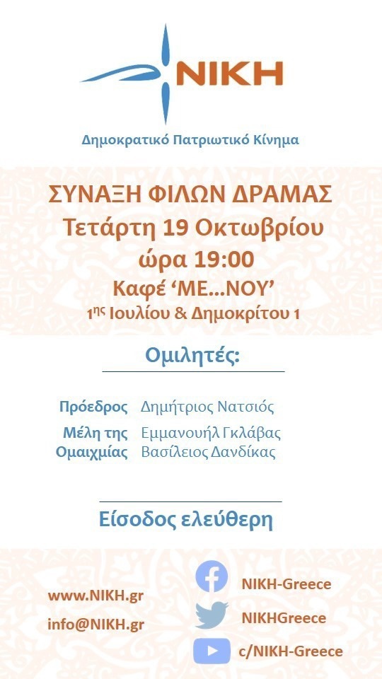 Ομιλητές στην εκδήλωση θα είναι ο Πρόεδρος της ΝΙΚΗΣ, Δημήτριος Νατσιός, καθώς και τα μέλη της Ομαιχμίας της ΝΙΚΗΣ: