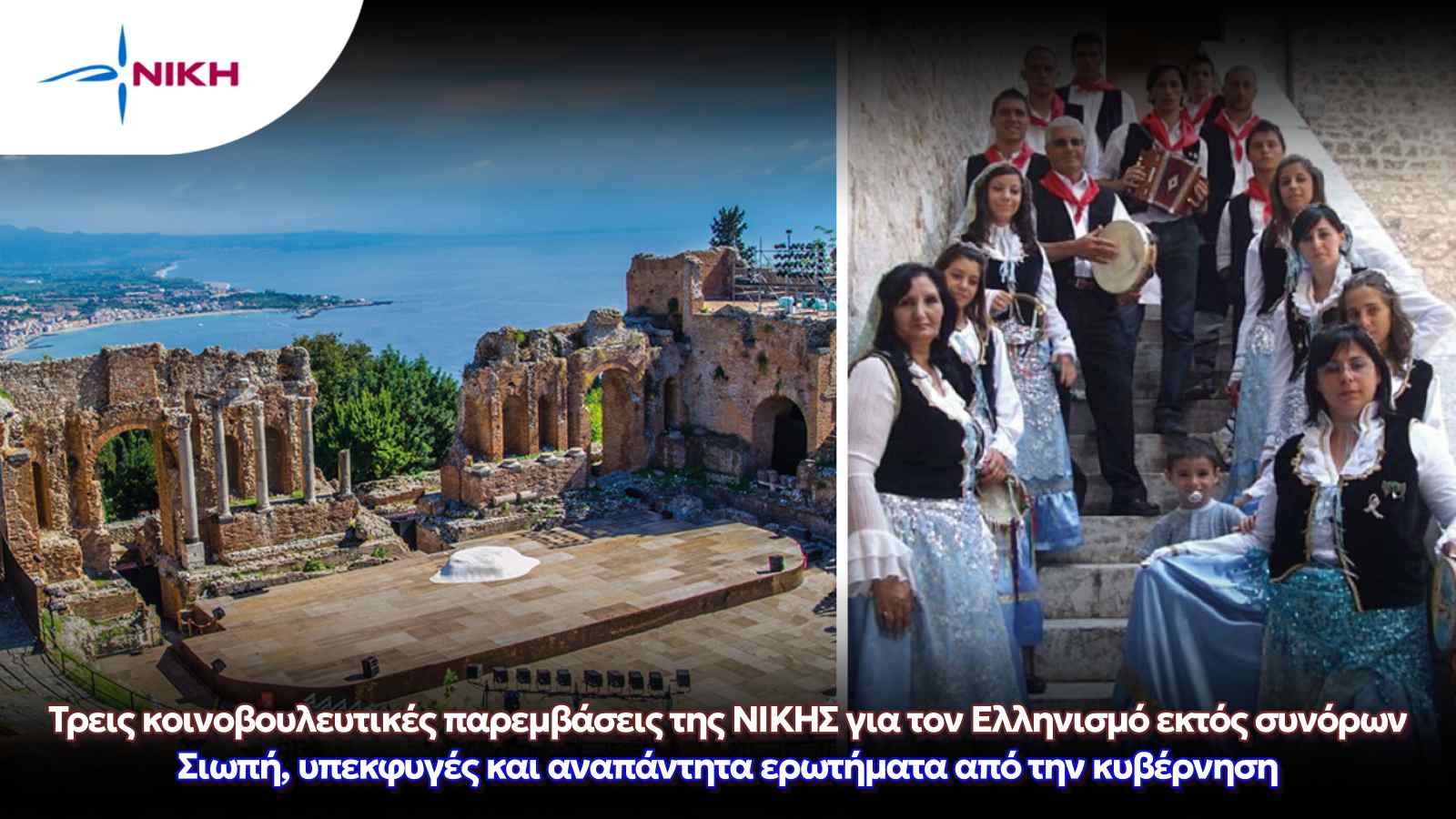 Τρεις κοινοβουλευτικές ερωτήσεις κατέθεσαν βουλευτές της ΝΙΚΗΣ προς τα αρμόδια υπουργεία, ζητώντας σαφείς απαντήσεις για το ενδιαφέρον, τη μέριμνα και τη στρατηγική της κυβέρνησης αναφορικά με τις ελληνικές μειονότητες της Χερσονήσου του Αίμου (Βαλκανίων), της Ουκρανίας, καθώς και τους ιστορικούς ελληνόφωνους πληθυσμούς της Νότιας Ιταλίας.