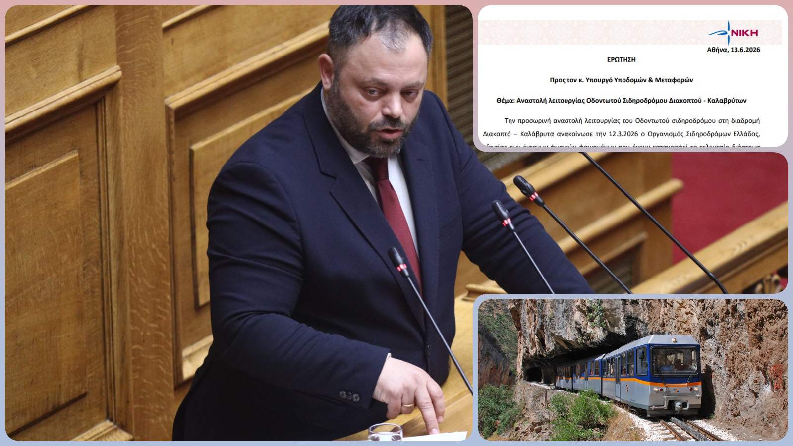 Ο βουλευτής Αχαΐας της ΝΙΚΗΣ, Σπυρίδων Τσιρώνης, κατέθεσε ερώτηση προς τον υπουργό Υποδομών και Μεταφορών για την αναστολή λειτουργίας του Οδοντωτού Σιδηροδρόμου στη γραμμή Διακοπτό – Καλάβρυτα, έπειτα από τις επικίνδυνες κατολισθήσεις που καταγράφηκαν στην περιοχή του Χελμού.