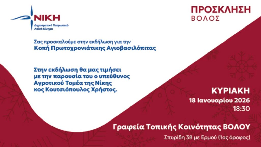 Η Τοπική Κοινότητα Βόλου της ΝΙΚΗΣ προσκαλεί τα μέλη, τους φίλους και όλους τους πολίτες της περιοχής στην εκδήλωση για την κοπή της Πρωτοχρονιάτικης Αγιοβασιλόπιτας, η οποία θα πραγματοποιηθεί την Κυριακή 18 Ιανουαρίου 2026, στις 18:30.